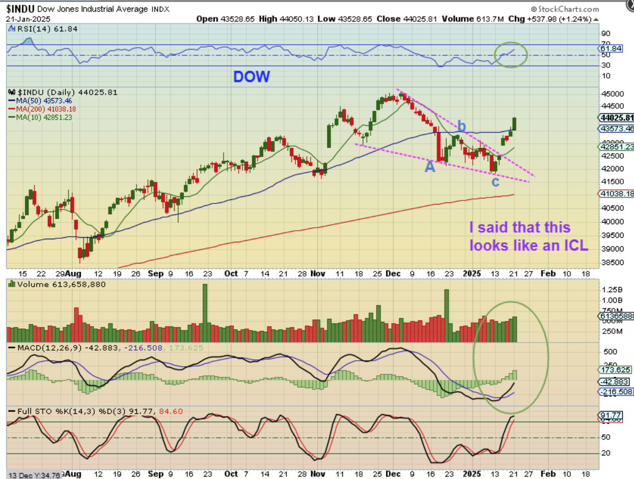 DOW – I discussed that the DOW has an a-b-c style drop that leads into an ICL. It is now in recovery mode and its running quickly higher as it recovered the 50sma yesterday.