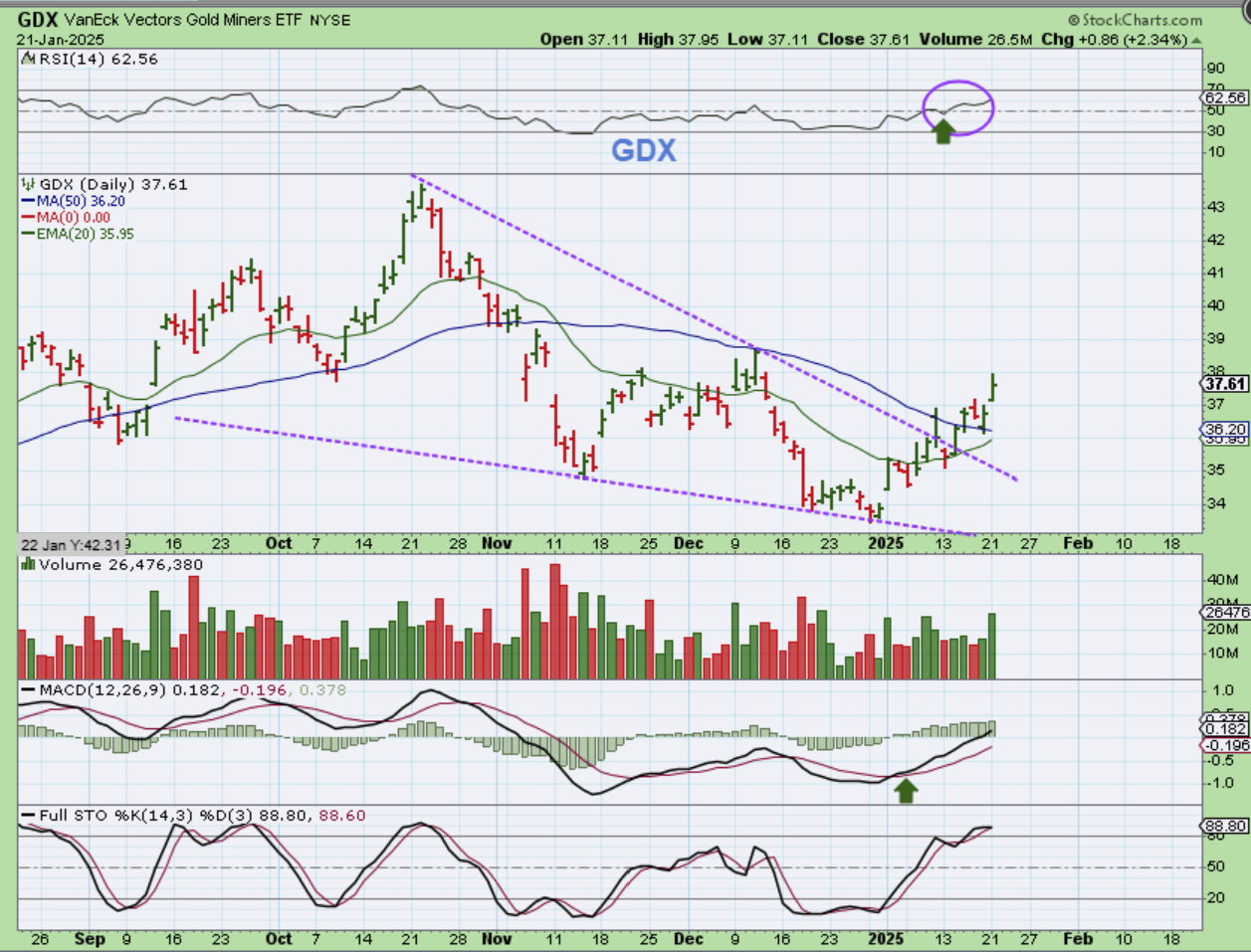 THE GDX broke above the 50sma last week and re-tested it last week too. GDX looks good as it comes out of the sell off lows, but individual miners are telling a different story, so stock picking is important so far. The leaders are leading, the laggers are lagging.  Let’s take a look…