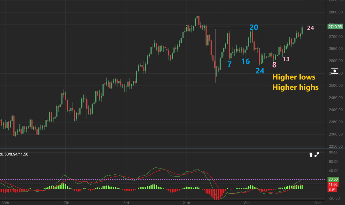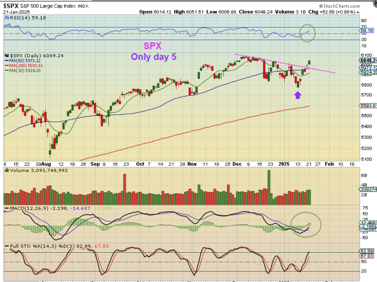 THE SPX regained the 50sma too, and this is only day 5 of the first daily cycle, so there should be a lot of upside to come. The RSI regained 50%.
