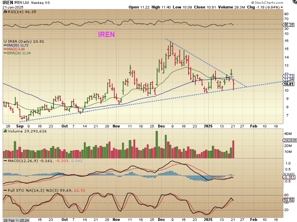 IREN was doing well, with a series of higher lows in place since September, but last week it broke above a downtrend line, and yesterday dropped back to the lows?  It did bounce off of that lower trendline by the close, but I owned it last week and I rode it higher and sold it sold it back at the low yesterday.