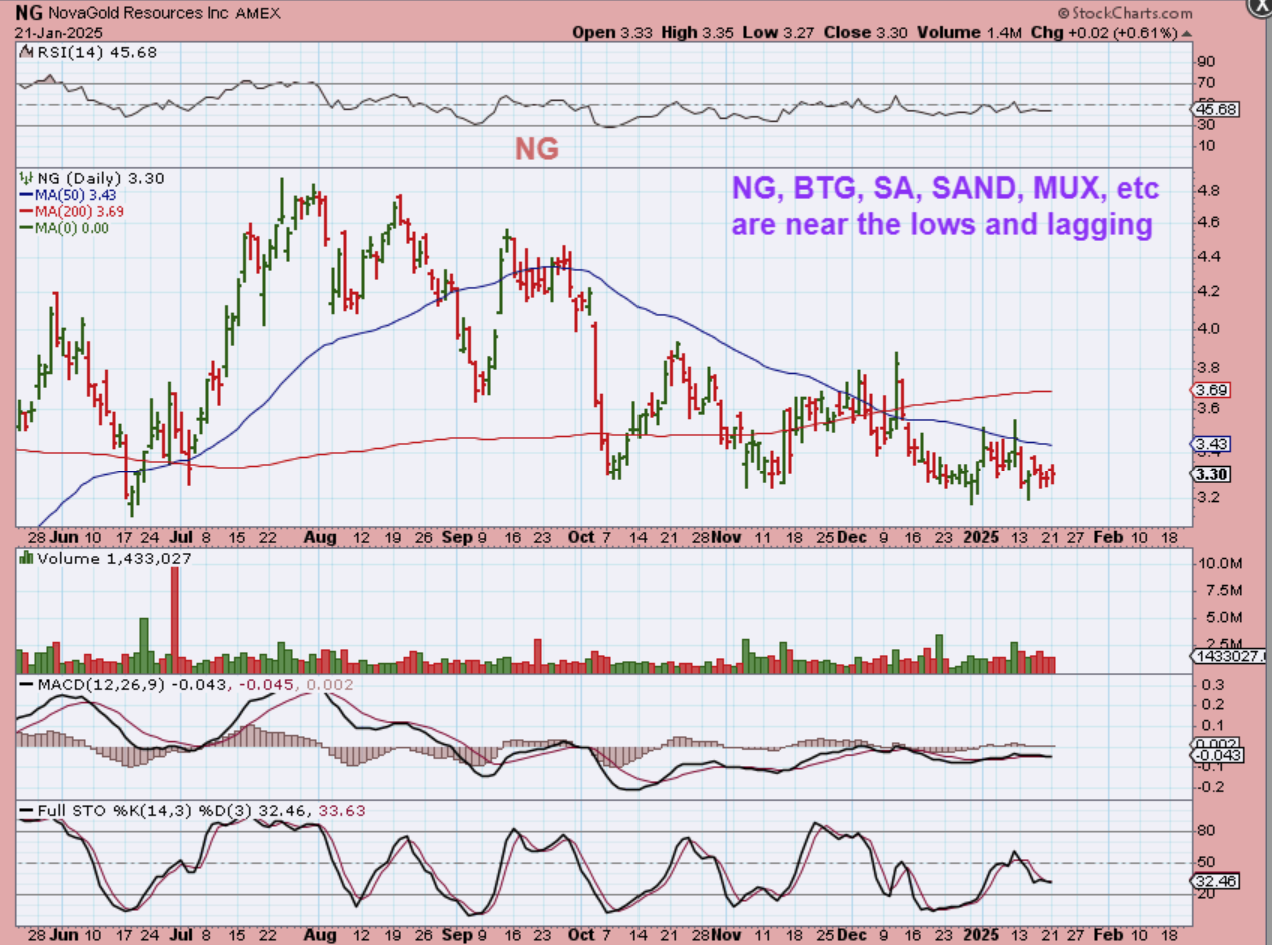 NG – Now take a look at NovaGold. It was at the lows and still slightly red on a day when Gold was close to the all-time highs? I listed a few others that are not rallying yet too. This could be a bullish descending wedge, so it may break out and run, but if this was in your basket of Miners, you were no doubt disappointed lately.