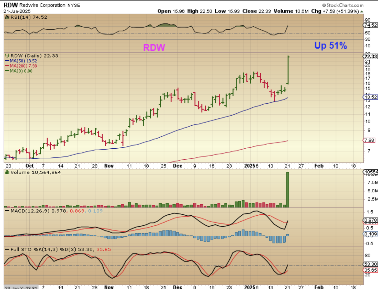 RDW – Well, forget this one for now. This was on my watchlist because it ran fairly steady from $3 to $18 last year.  After the market correction and a drop from $18 to $13, it Popped 51% yesterday alone. Look at that perfect tag of the 50sma. Buy a pullback near the 50sma if you see one.