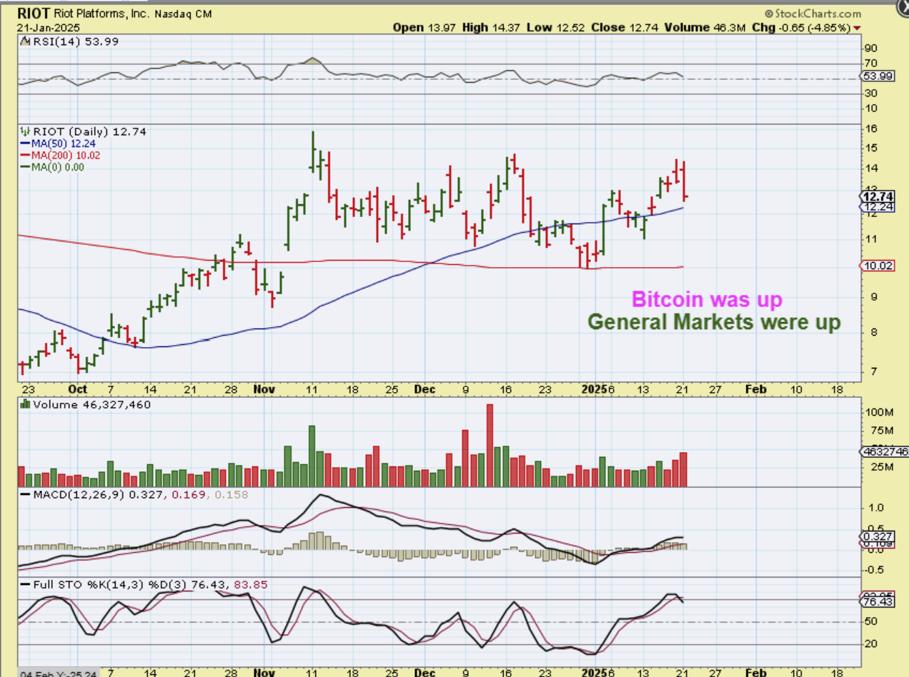 RIOT moved back to the highs, but yesterday when Bitcoin was finishing making that cup, it dropped? This was with the General Markets higher too!  Was it the only one? No…