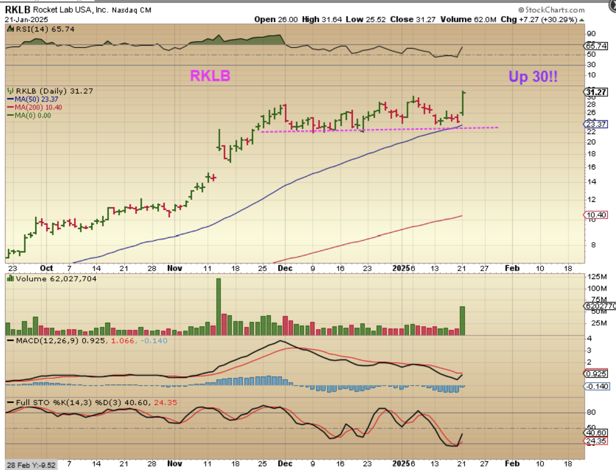 Another one that I have mentioned in the past shot up without me. RKLB gapped up and kept going, up 30%! Notice again a clue of its’ strength…