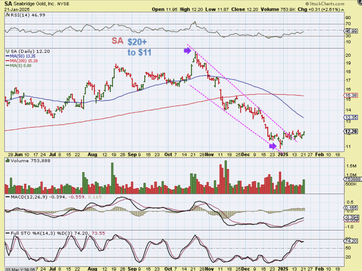 SA – Another example is Seabridge Gold. This had a decent (but choppy) run July to October, running from $13.50 to over $20. Now it dropped to $11 and is only at $12.20, with Gold quickly heading back to the all -time highs? I feel like SA is a buy, because volume popped and it isn’t dropping anymore, it is chopping sideways, but up until now this is very disappointing with Gold 1. putting in a triangle of higher lows, 2. breaking the downtrend and 3. running to the highs again.