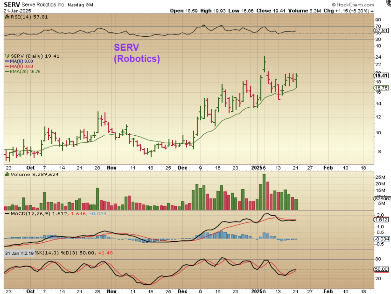 SERV is one of the bullish ‘robotics’ stocks. This is extremely choppy and tough. If you looks at the drops, they were $15 to $11, and then $18 to $14 for example, even the highs of $24 to $15 in 4 days, but it is chopping higher and went from $8 to $24 in less than 2 months, right?  I guess you could call this a buy at the 20sema, and that was yesterday and maybe today.
