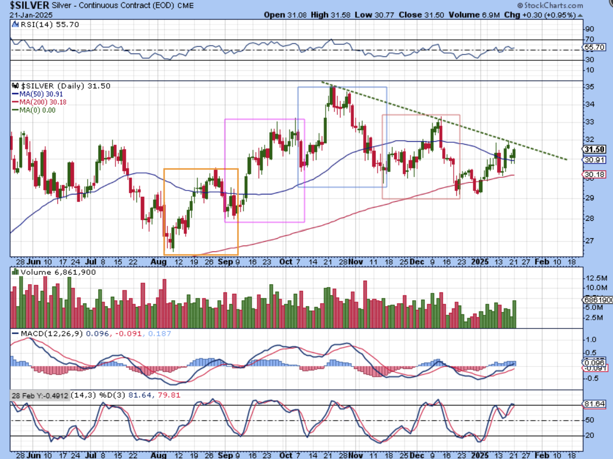 SILVER has not broken the downtrend and it lags what Gold is doing. As a Bullish sign, Silver did a minimal shake out at the 200sma and has regained the 50sma. This is a 5th daily cycle or a first, since Gold has an ICL and Silver does have an a-b-c down into the recent low. Volume increased yesterday too.