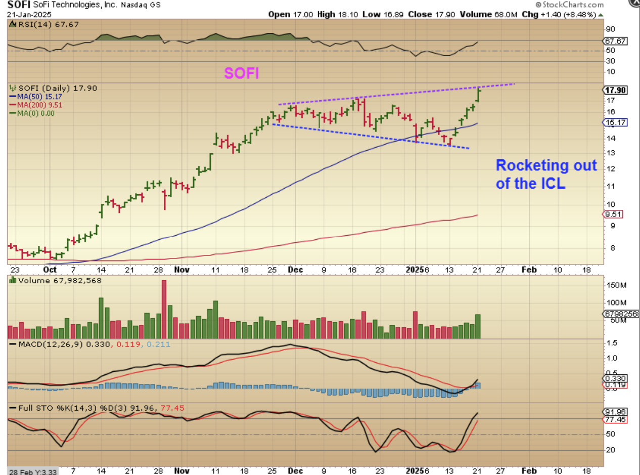 I really liked SOFI and mentioned it a few times during the pullback. It ran from $6 to $17 since last August and this one actually did pull back with the market correction and lost the 50sma, but regaining it was the buy. Now we may have to wait for a dip, maybe a back test to the 50sma eventually? The last 5 days saw it rocket back to new highs and it does not pull back often when it gets running (See Oct to Dec for example).