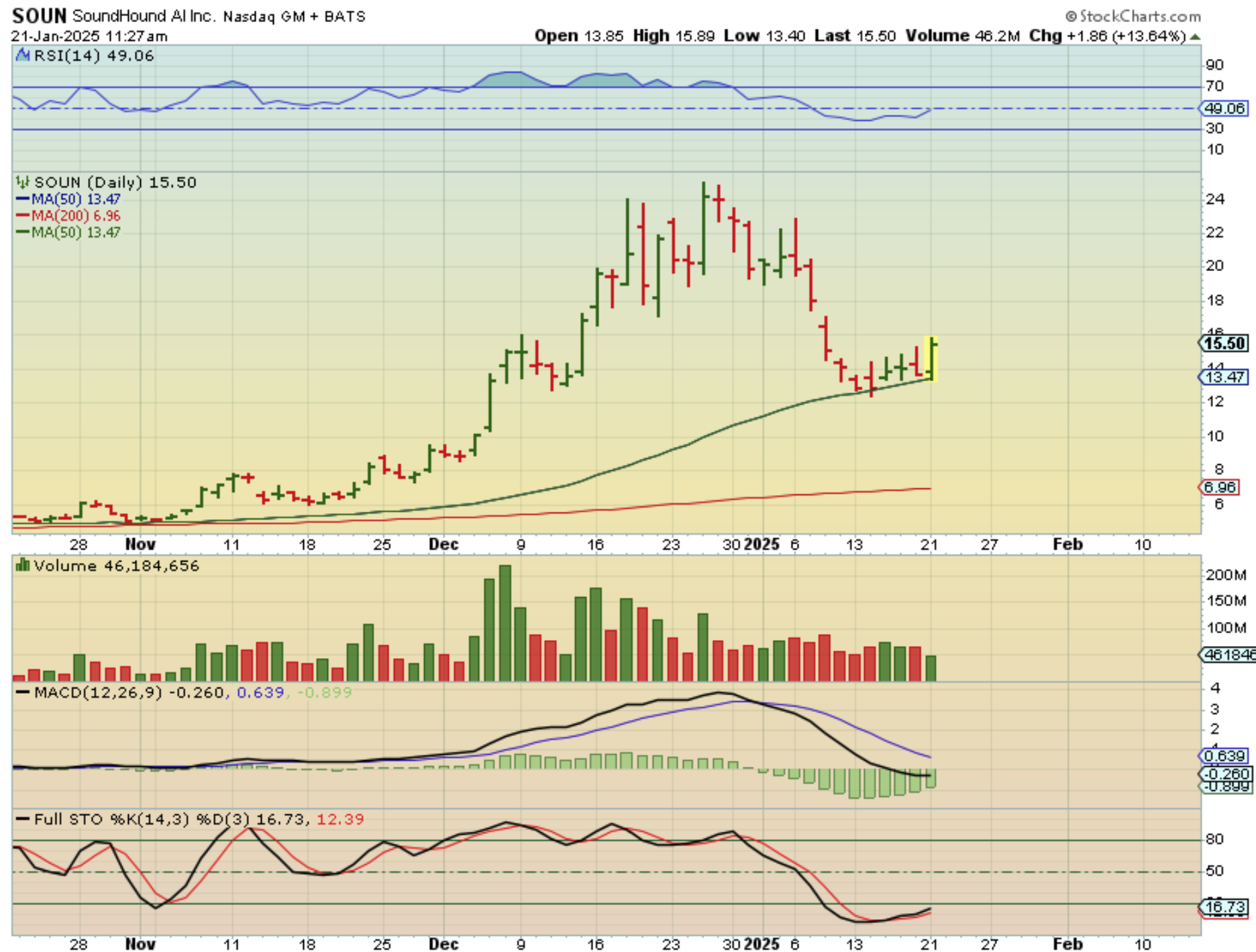 SOUN is an ‘AI’ stocks that has not started to run again yet, but it does looks ready. A closer look shows us that it ran from $6 to $24 in 2 months. It is extreme with the drops at times, but the gains were quite good.