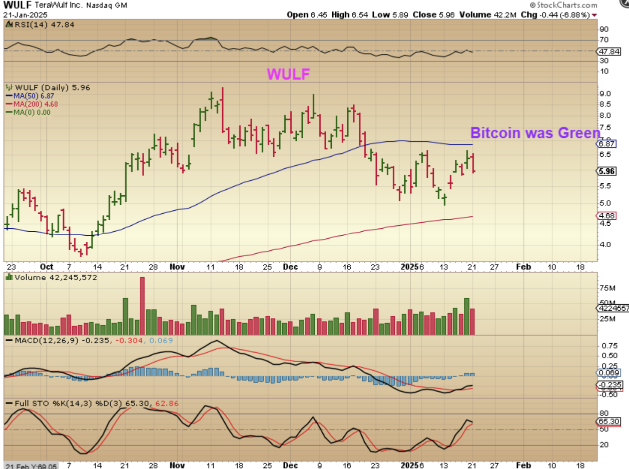 WULF started to move higher last week, but it also dropped yesterday, with the General Markets higher and Bitcoin green. There are signs of good health, like the MACD, but this was not a bullish move.