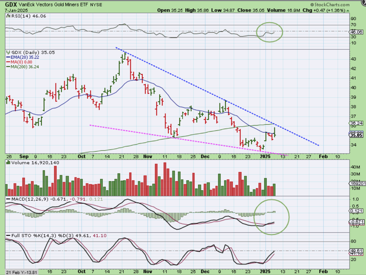 GDX popped and dropped yesterday too. You can see that price is climbing higher out of the recent low, but it is choppy and frustrating.