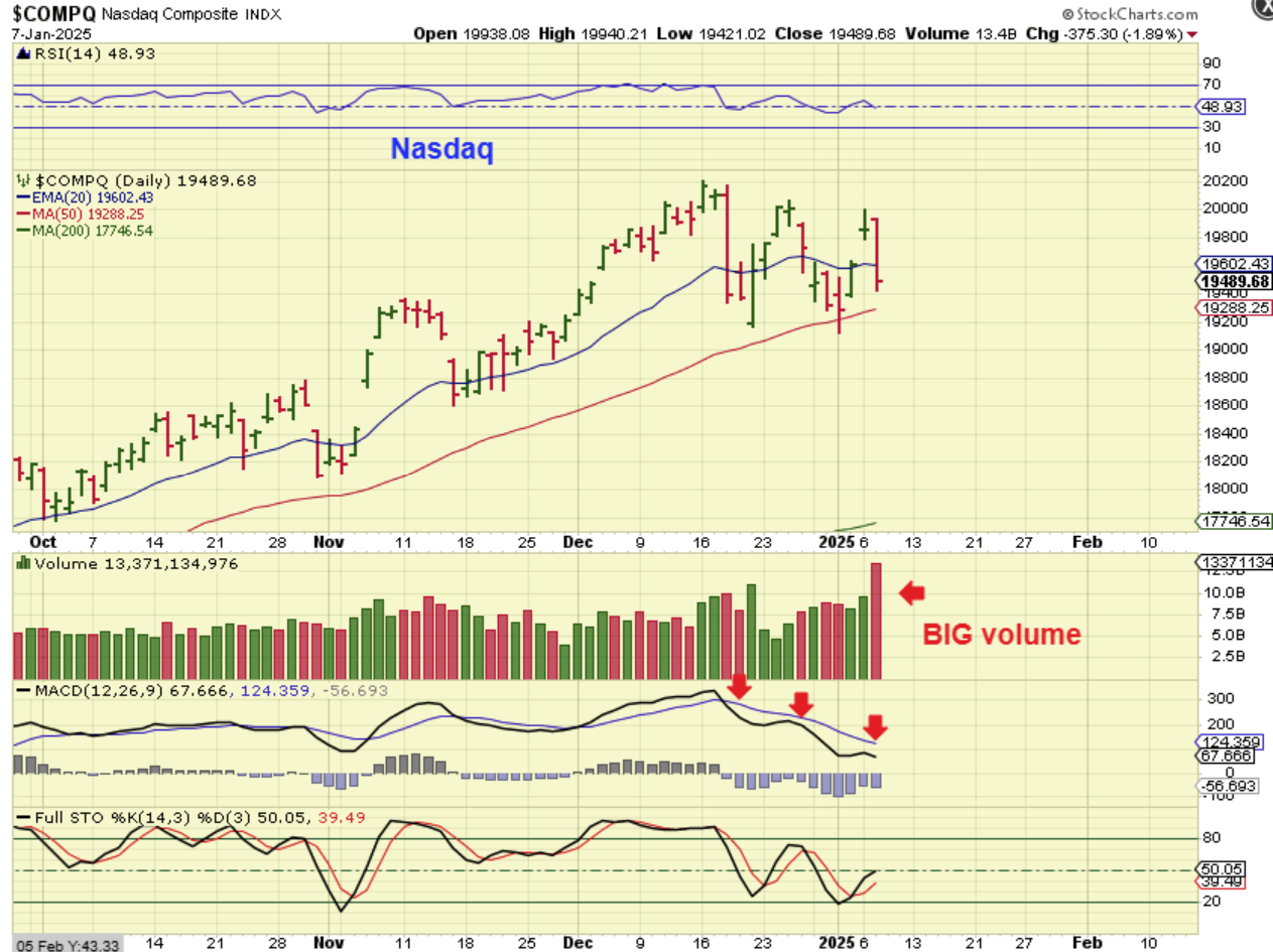 Zooming in on The NASDAQ, I wanted to point out the heavy volume and large price candle. Is this day 34 or is this day 3? Monday was a large bullish gap up higher, Tuesday was a bearish looking heavy volume slam down.