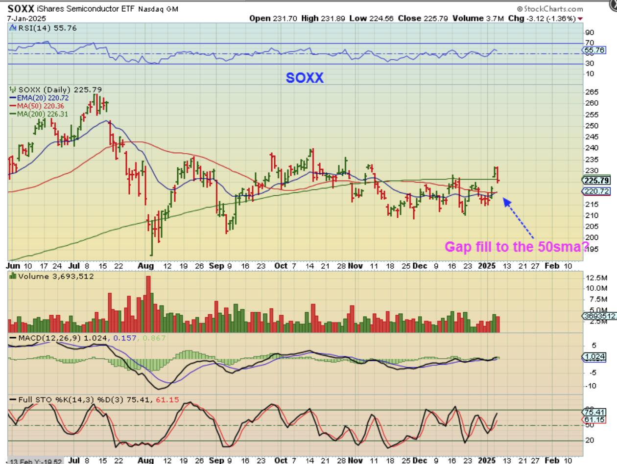 And of course, The SOXX made a very unusual & bullish move on Monday by gapping up and over the resistance area, only to drop down and start to lose the 200 sma again. There is no way to know, at this point, if this is just a short-term reaction and the markets will continue higher or not. We’ll have to watch and see which direction has the follow through.