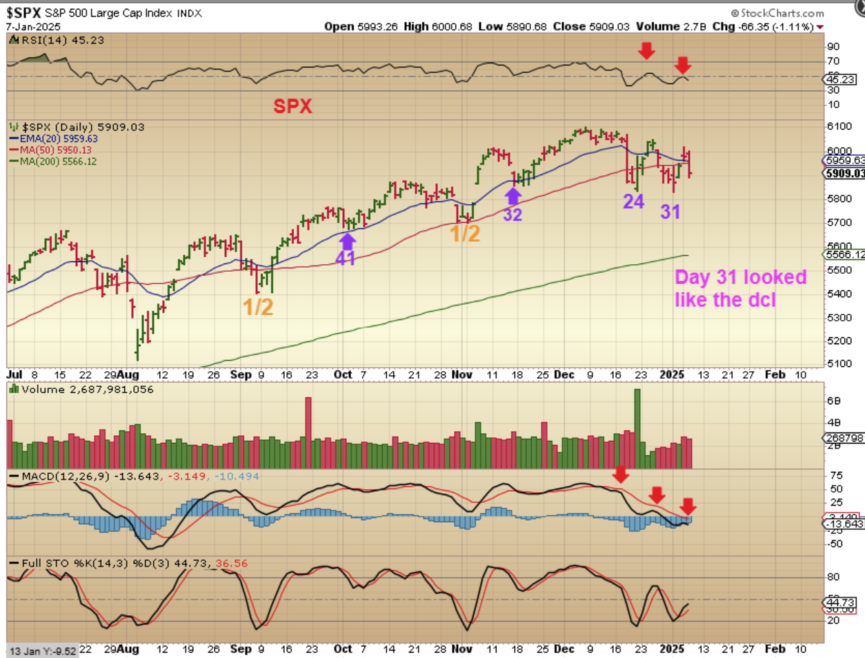 I discussed that it looked like we had a dcl on day 31 for The SPX.  Price closed above the 50sma & 20 ema and it looked like we would rally, but yesterday the markets sold off pretty hard when it appeared that the Fed would not need rate cuts to help the economy. We must now be aware of follow through to the downside.