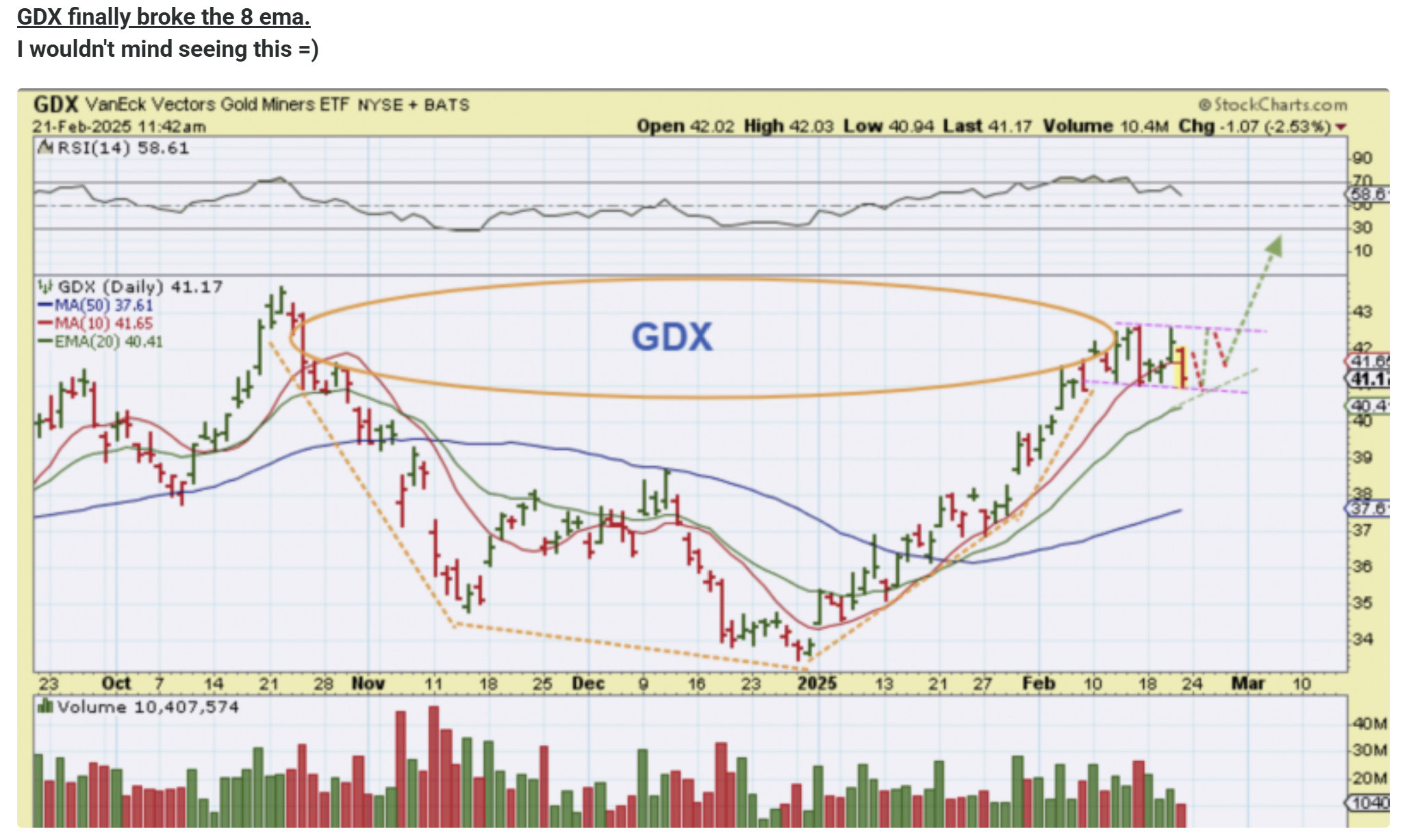 Friday morning when the market was open I mentioned this about the GDX when it was at $41.17. The 20 ema green line was at $40.41. It could drop there and it did sell off further as the day went on. DID IT BREAK $40.41?…