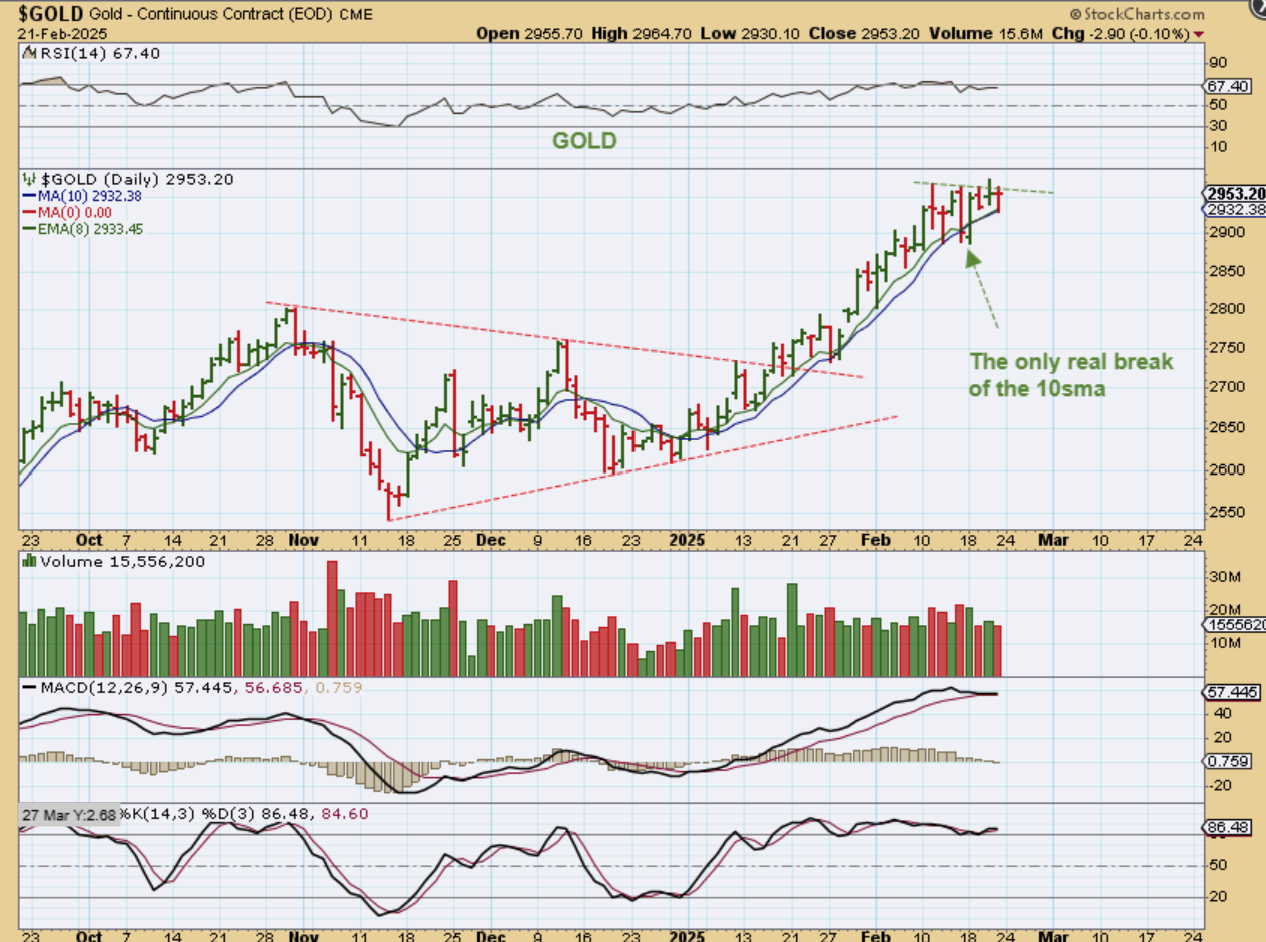 GOLD dropped and bounced back and remains strong. Not much more can be said about a chart where price barely breaks the 8 ema / 10 sma. It is very strong, but that recent dip below the 10sma could be sort of a low that has now formed in a pennant. Gold remains bullish until we see a real change.