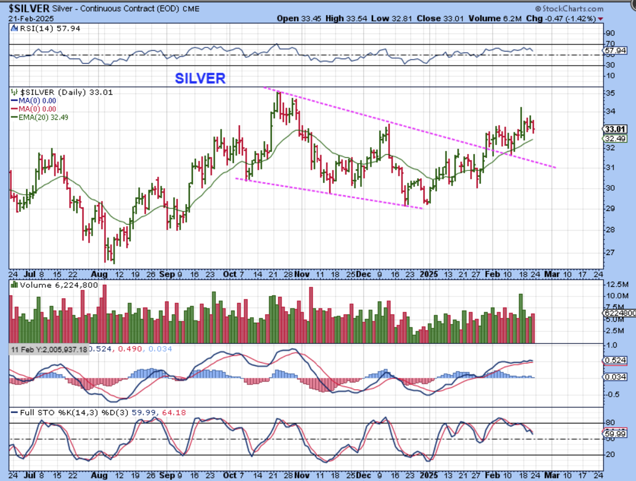 Looking at SILVER this way in an upward channel, I am still just seeing moves to higher highs, but again, it is mostly a sideways chop that we see week after week. This is very frustrating and I have been chopped about in my silver stocks too. They are off of the lows, but can’t hold on to the gains.