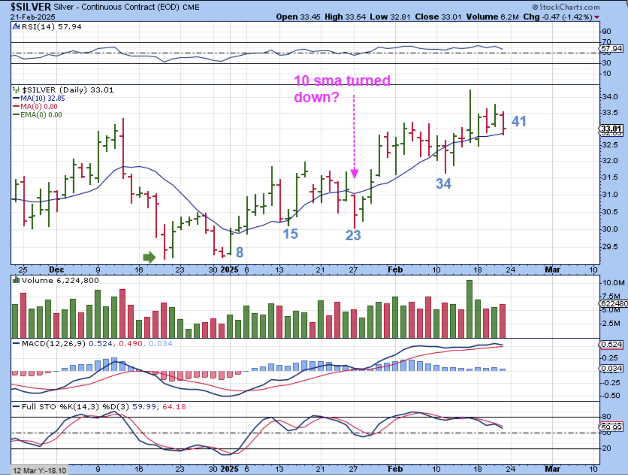 When I look at SILVER to find a dcl, it is too choppy to know for sure, so here I am simply going to count “How many days do we have out of the lows?“, knowing that roughly 30 days would be a dcl.