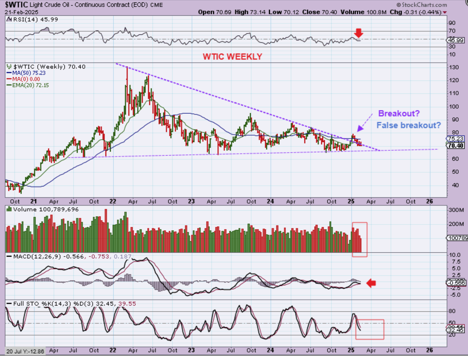WTIC WEEKLY– This now looks like a breakout and a back test(?), or a false break out that will now break down. There is more room for selling in the Stochastics, so we could see a failed daily cycle and a breakdown. We just need more time, so I wouldn’t be long or short here yet.