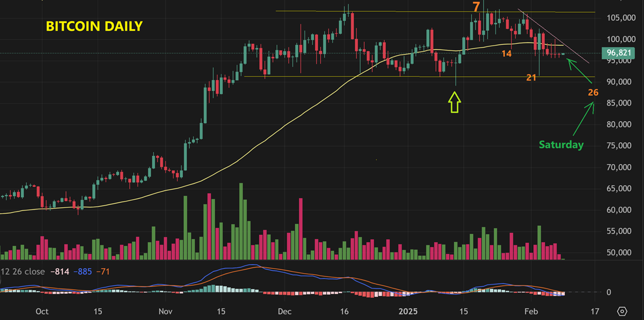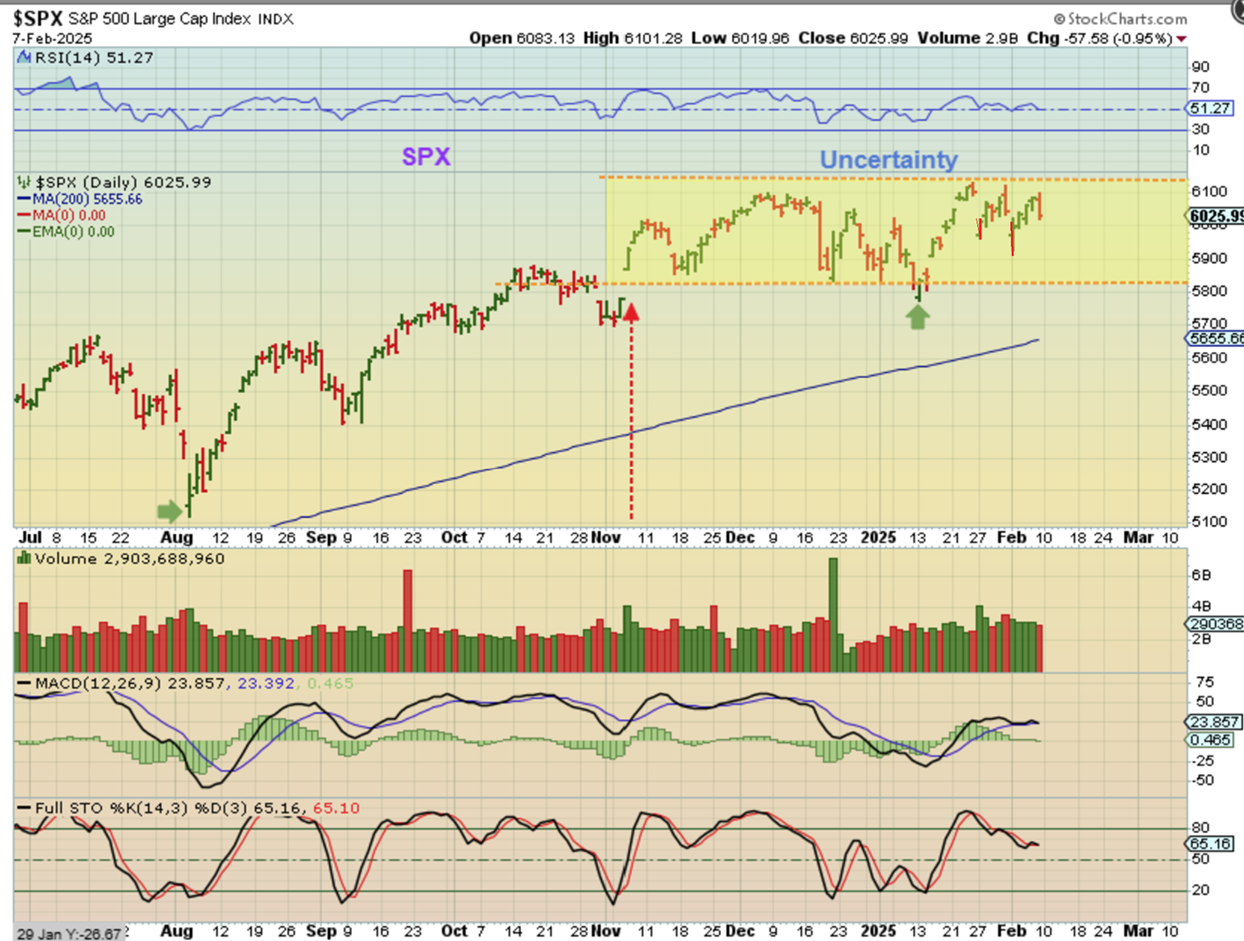 SPX DAILY – The markets do not like uncertainty, and we have had some ‘news events’ that have caused a degree of uncertainty. As we rallied out of the ICL, we have had concerns about what tariffs might really do with the economy, and how will the current leadership affect international relationships? you may recall the ‘AI’ news that caused a 1-2 day crash in tech. So when we look at the chart we see that we are only halfway through the first daily cycle, but we keep reversing and dropping.  This chart shows the drop into a reversal candle as a green candle for some reason, but it should be a red down day, so I want to redraw that…