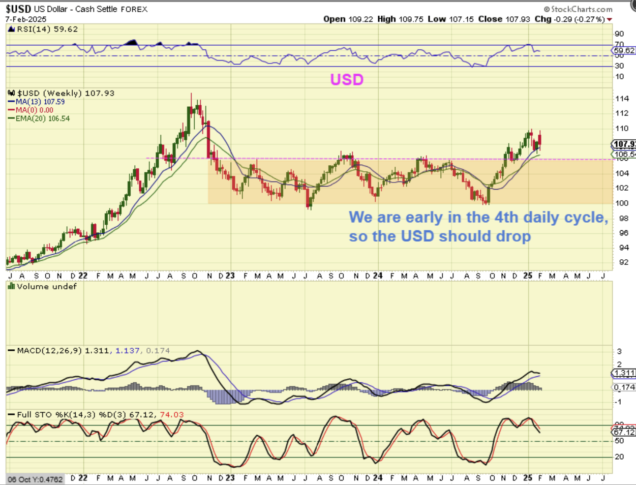 USD WEEKLY – I’ve been showing on the daily charts that we had 2-3 strong daily cycles higher, but this 4th one is starting off as a weakening daily cycle. I have expected the USD to roll over into an ICL sooner than later.