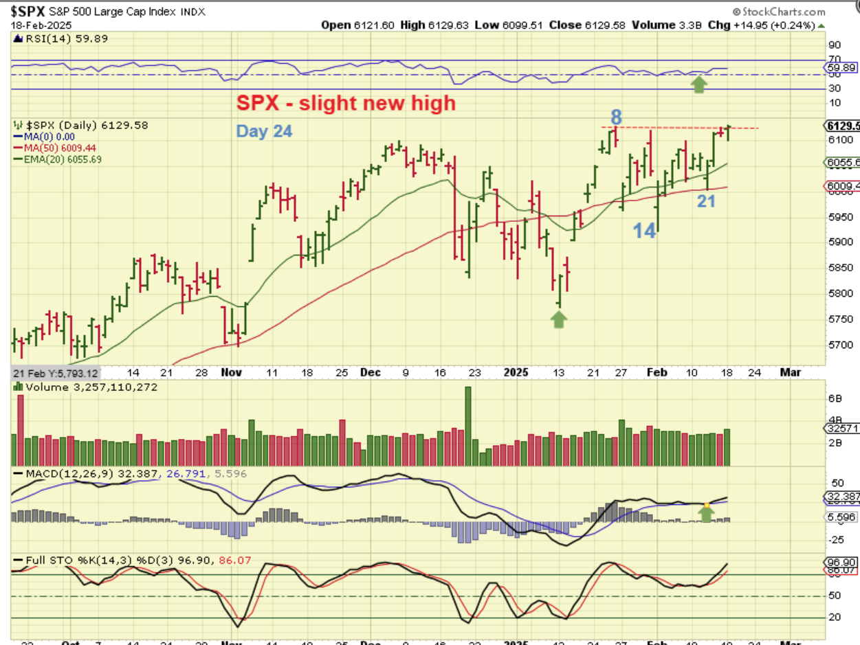 THE SPX made a new high on Tuesday, day 24.  It can continue higher before pulling back into the next dcl, which may not come until after day 35.