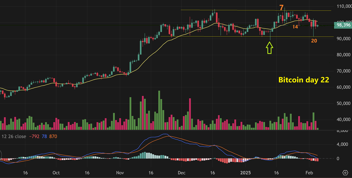BITCOIN went from having a triangular consolidation out of the recent lows to a short term crash that seems to have given us a long box consolidation too. We are now on day 22 out of a possible 60, but we often see a day 30(ish) dip, so hopefully this is the dip arriving early and we can now move higher. If not, we could run up and drop into day 30 again too. I will say that I did start to see crypto stocks hold up yesterday, but that may just be that they follow Bitcoin when the general markets are acting ok.