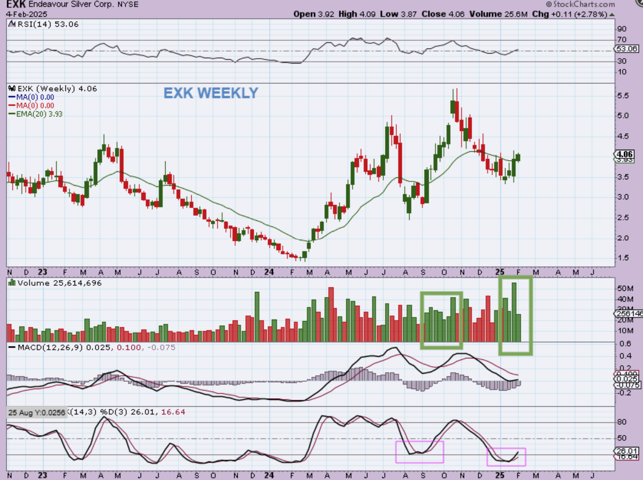 EXK WEEKLY -The volume is swelling, ICL is in for Silver, and EXK has made a nice run out of the last 2 lows. Yes, it is choppy and pulls back here and there, but a buy and hold basket can pay off over time.