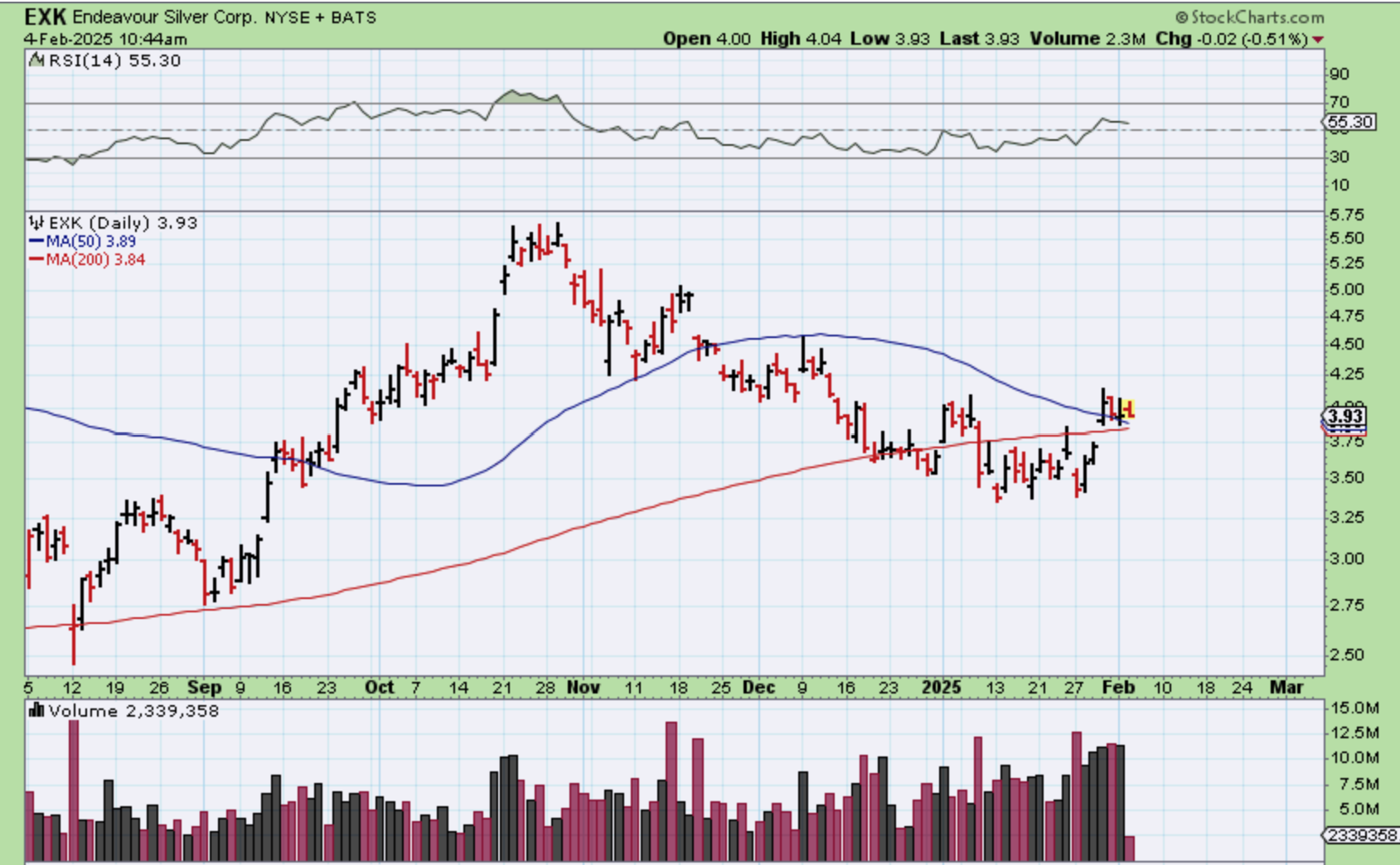 EXK broke above the 50 & 200sma, and in the morning it was red. It closed green and lets take a big picture look at EXK…