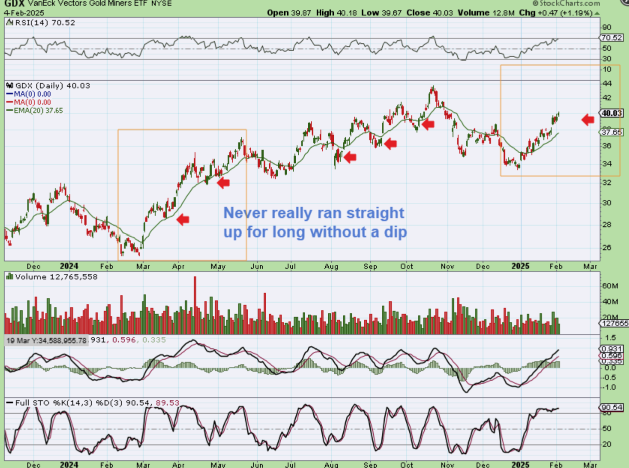 Right now, it feels like GDX is running away, but I wanted to remind everyone how much they hate the dips when they do come, because those dips can actually last for weeks! Take a look at each red arrow and notice that it has 5,10, even 15 days of chop at those arrows (that is 1-3 weeks of trading). In fact…