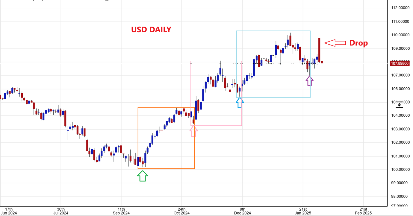 THE USD popped and dropped sharply, according to this chart. This is the 4th daily cycle, and I am expecting it to remain L.T. and then roll over sooner than later.