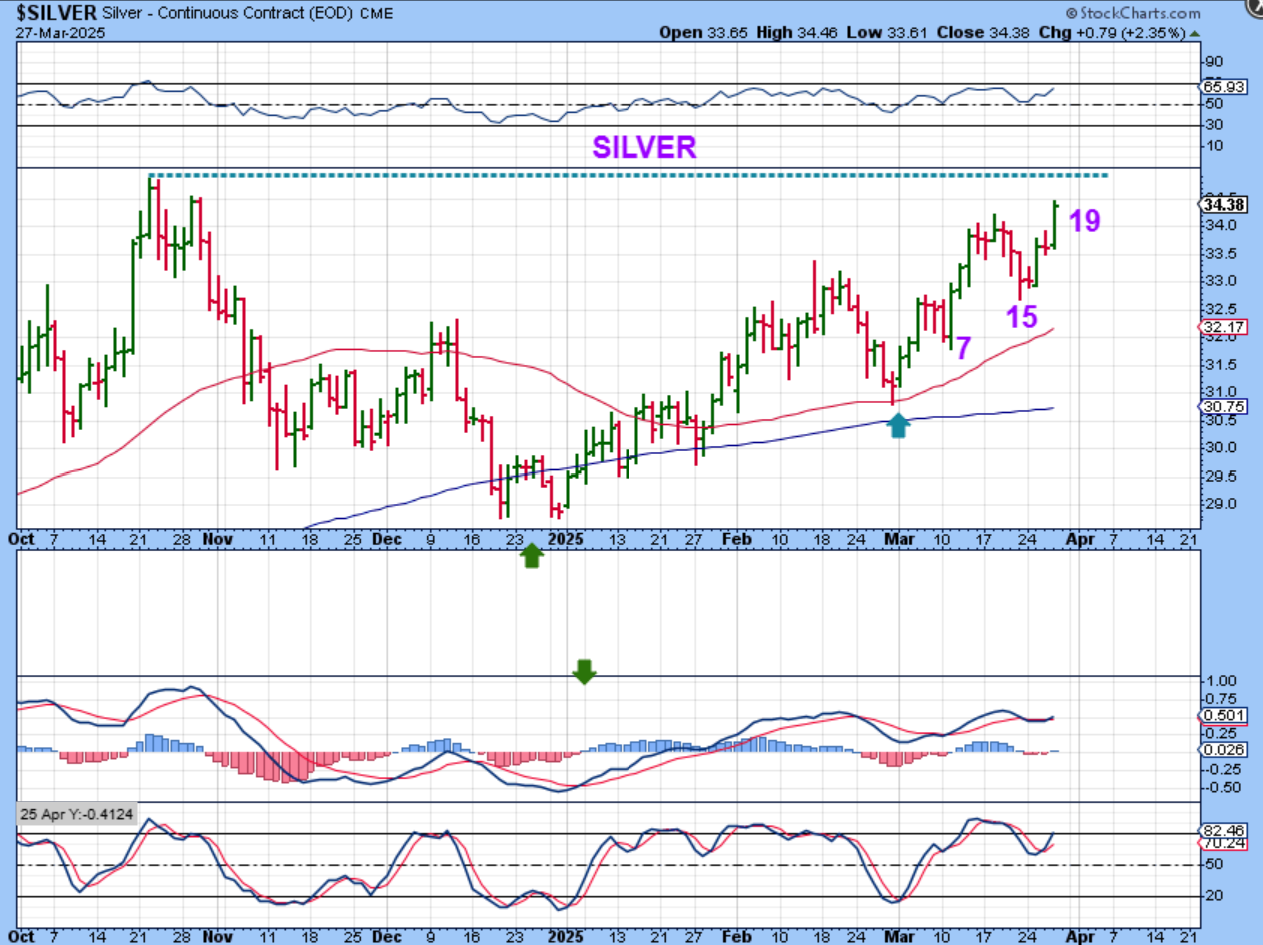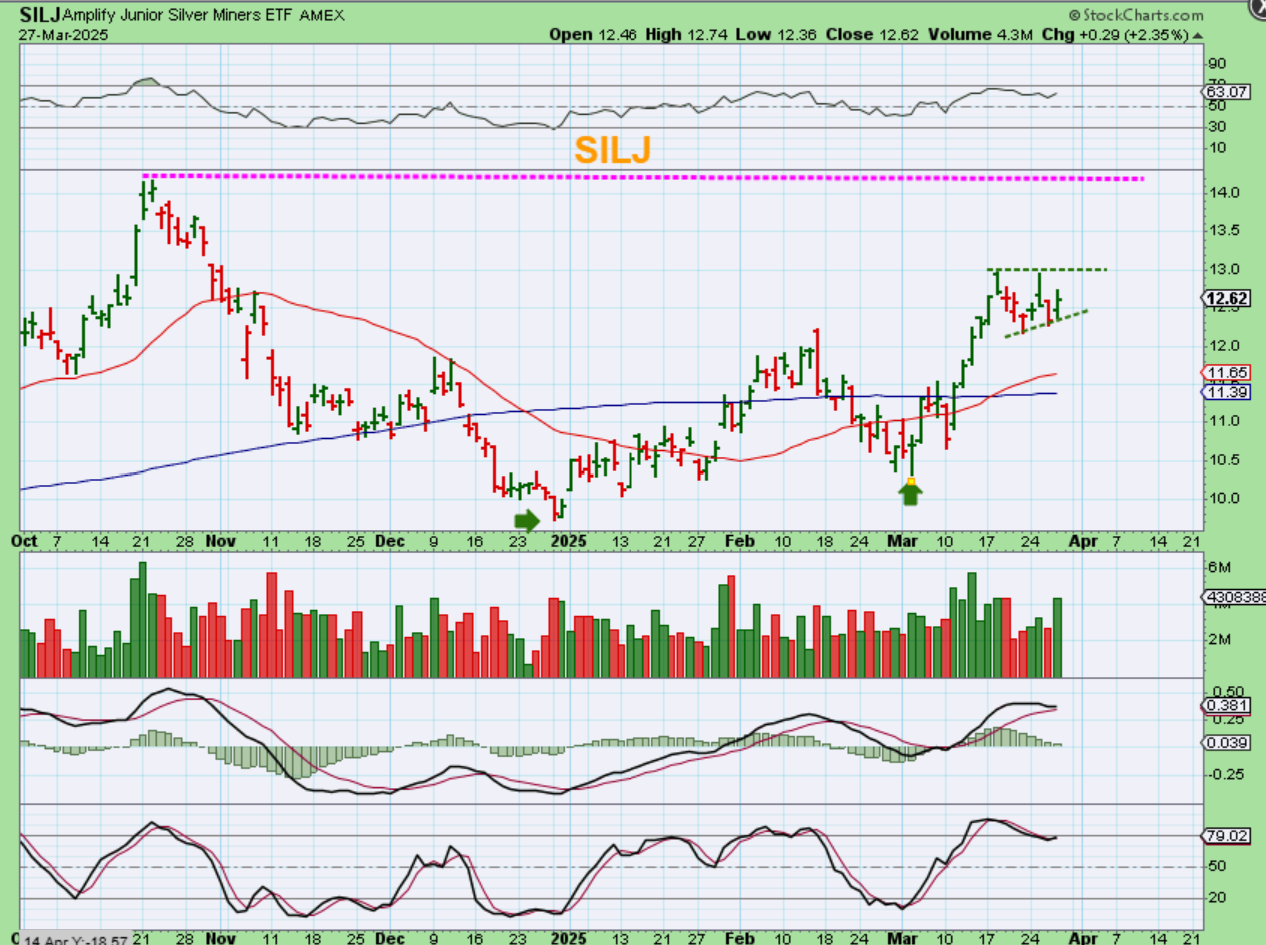 SILJ represents Junior Silver Miners – You can see that many silver Miners have not made it back to the October highs, but they are bullish and trying to keep up with Silver. Volume buying has been increasing, so the recent rally was almost straight up in early March. Silver is on day 19, so Silver it is possible that miners could play catch up to October highs.