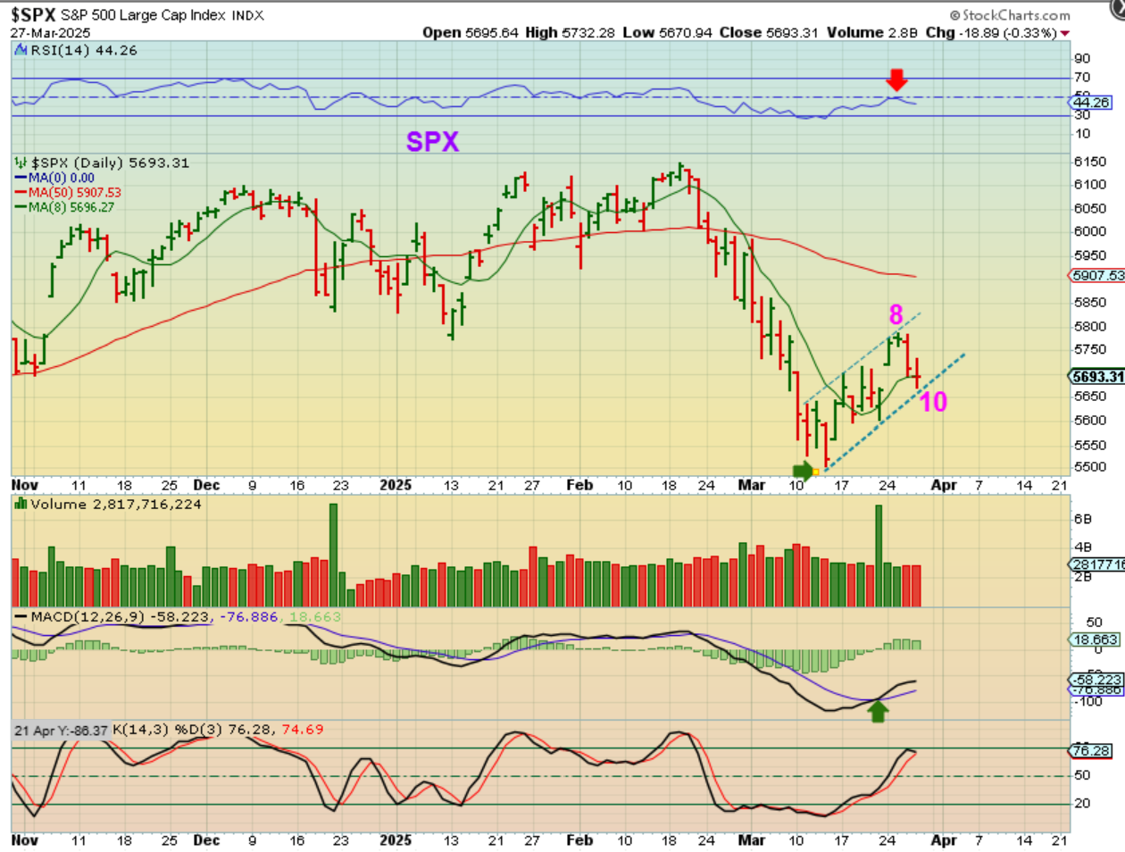 The General Markets can move higher and start to add to recent gains, but it is also possibly just a bounce in the sell off that started in February. When we came due for a dcl (possible ICL) I said that we would normally buy that swing low in case it rallies quickly with short covering and buyers. We would then have to start taking a look at it around day 10 or so for clues. Right now it is not giving solid clues as to whether or not it will rally higher or start to sell off and break the lows. I was hoping for and mentioning a possible V-Bottom that would clearly show an ICL, but as you can see here… we have a choppy channel higher at this time. You can raise stops, but there is a chance that you’d be stopped out and have to get back in if it takes off higher next week.