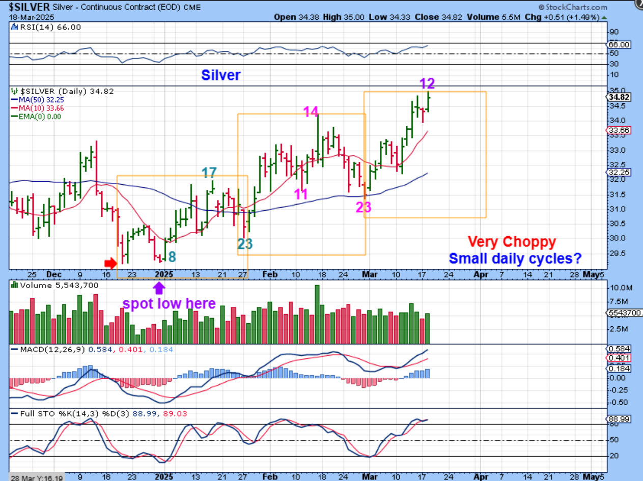 SILVER: Trying to find daily cycles in this massive chop was tough. I do see 2 with 23 day daily cycles, so that is a possibility that we are on the 3rd daily cycle.