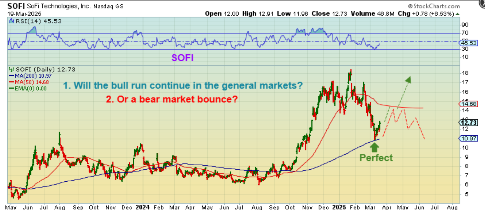 SOFI did a perfect reversal at the 50sma as a buy. This ran from $6 to $18 at the end of 2024, so I drew a return to the highs in green (Bullish General Markets) or a run to the 50sma and a stall (if the markets get choppy and difficult again). In a Bull market, this could easily run from $11 to $30 or more.