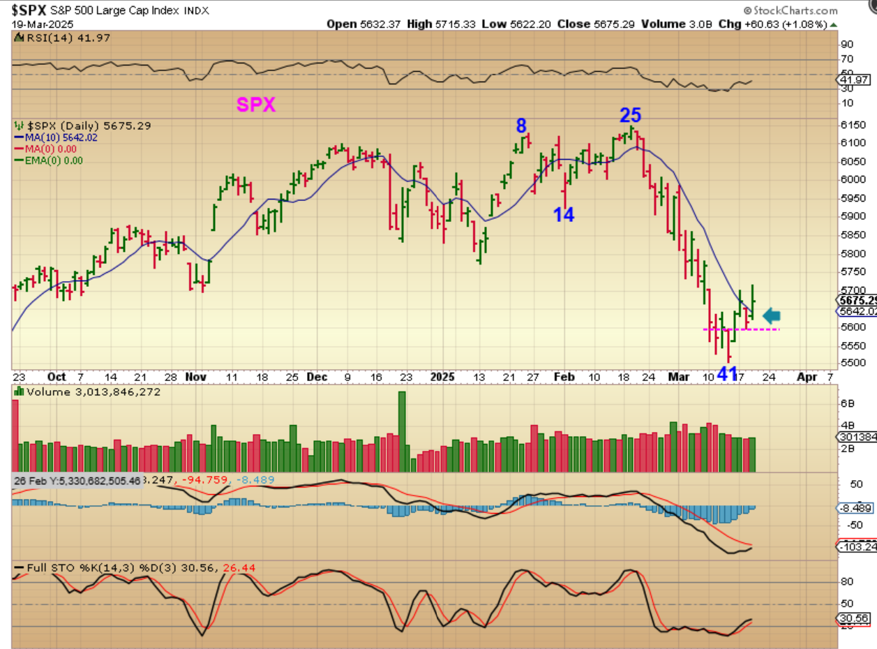SPX – We were watching for a ‘swing low’ to be confirmed with a move & preferably a close above the 10 sma. We now have that, so this should be day 4 of a new daily cycle. There are no guarantees, but if we get ‘short covering’ & buying together, we could see a rapid recovery and a V-Bottom. So far, we have a choppy bottom and jobless claims today.