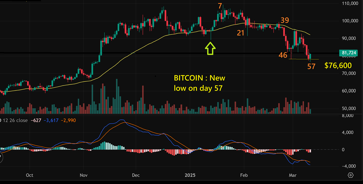BITCOIN DAY 57 Reversal:  This is Bitcoin at 6 am Tuesday and as you can see, we do have a reversal candle at day 57 with a new low of $76,600. This has the possibility of becoming the low that I have been looking for, since the timing is very close and I do see a slight divergence in the MACD as price made a new low. I still have to point out as a cautionary note that we might still see Bitcoin bounce and drop one more time to a new low on day 61 for example, but the timing is very close for a low and another drop would likely be short lived.