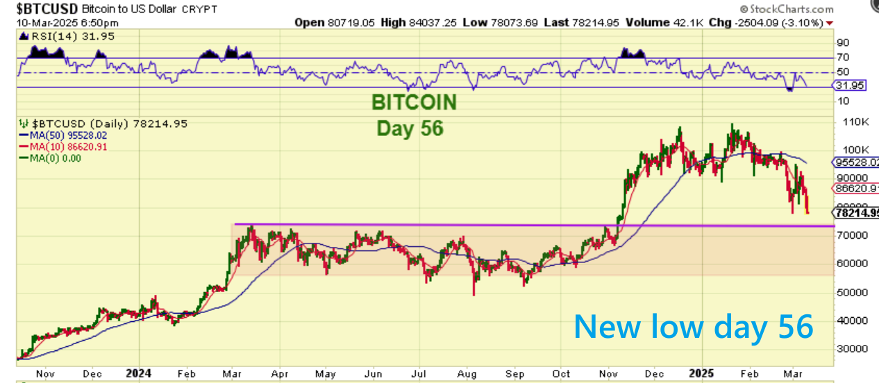BITCOIN has dropping to a new low here on day 56 (as expected here at Chartfreak). This chart was captured midday and shows a large support area that may be a target for Bitcoin in the $75,000 Area. Note: Any reversal in this area could become the low, since we are very close to my day 60 count.