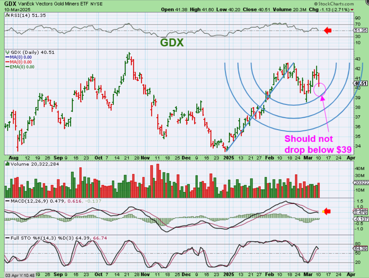 GDX dropped 2.7% with the markets yesterday. Since I have been using the Fibonacci Arch, I’ll just point out the $39 area as a place that I would not want to see price lose. Obviously losing the recent lows would be very concerning.