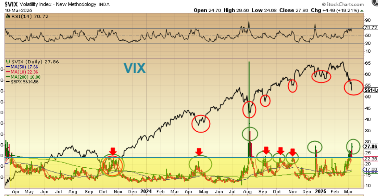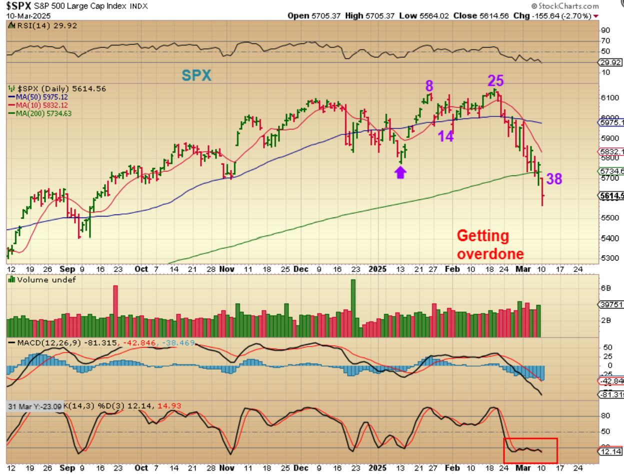 On this chart, the VIX is at the bottom in that yellow area and price of the SPX is above. The prior Vix Spikes to the blue line were often used to call a market ‘low’ as being close or in place (when the Vix spike reached the blue line at the top of the yellow area). Occasionally we get an EXTREME SPIKE and we are at that point now, so a low in the markets really is coming due at any time. Extreme bearish sentiment, like we have now, is also a good indicator that this heavy selling should begin to exhaust and short covering can cause a rally out of the lows.