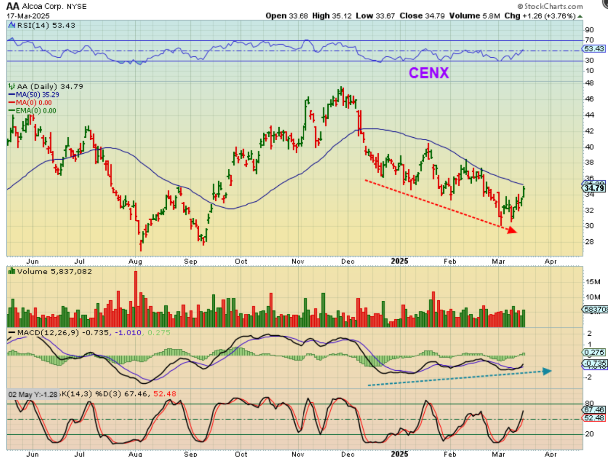 AA – Alcoa has divergence at the lowest low and it also stopped selling off before the general markets did.