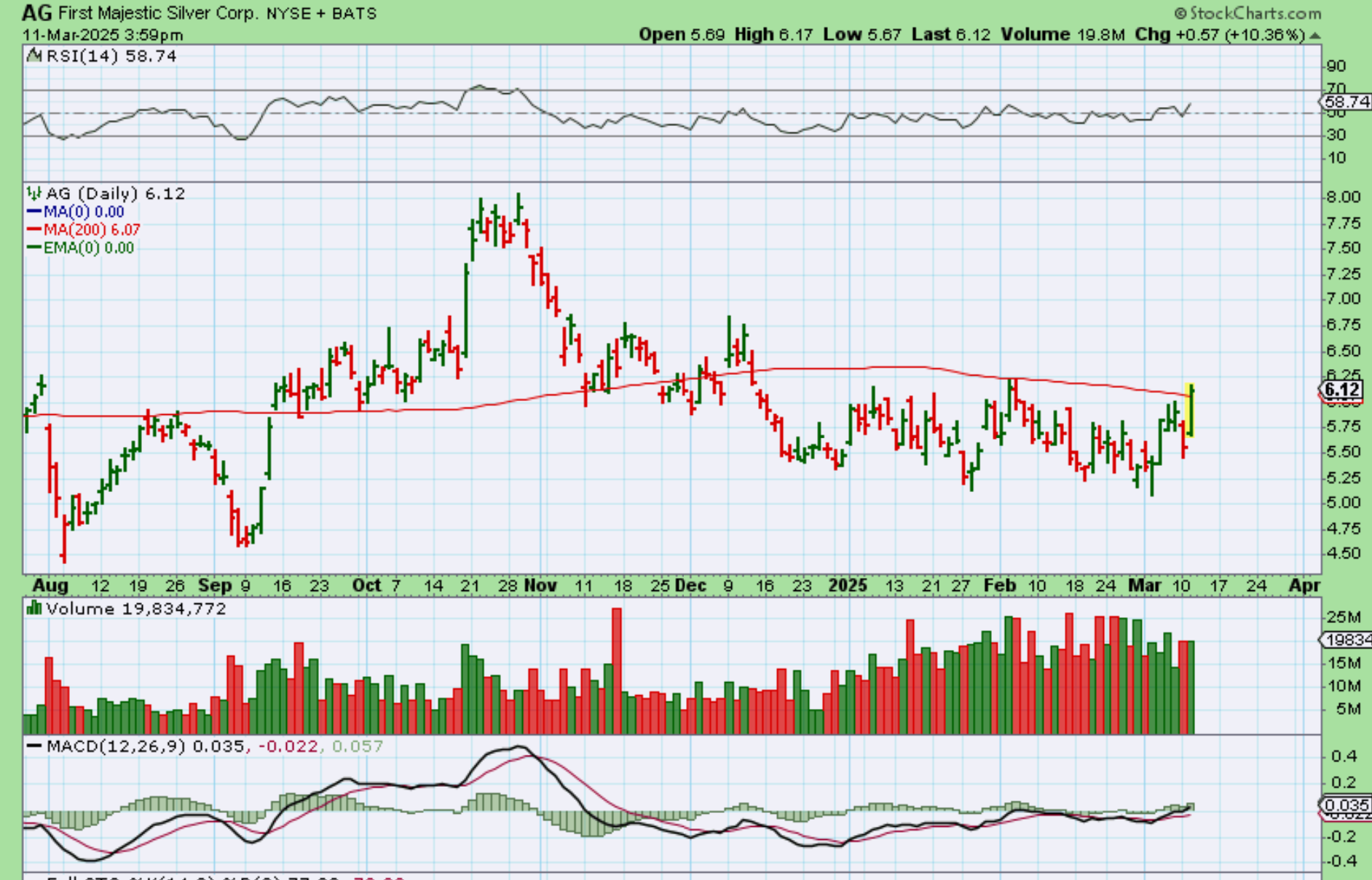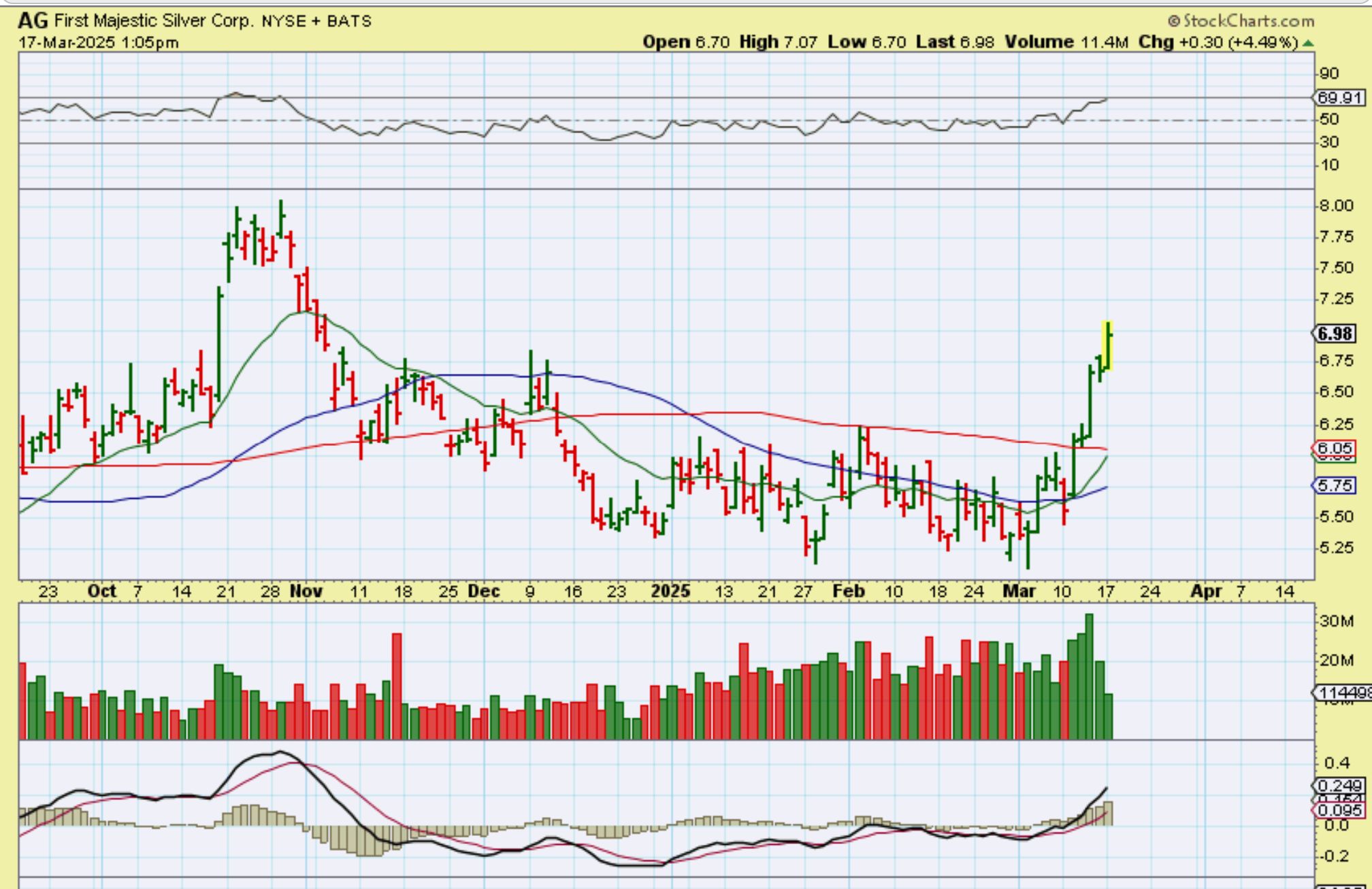 AG hit $7.07 on Monday and is climbing bullishly higher.