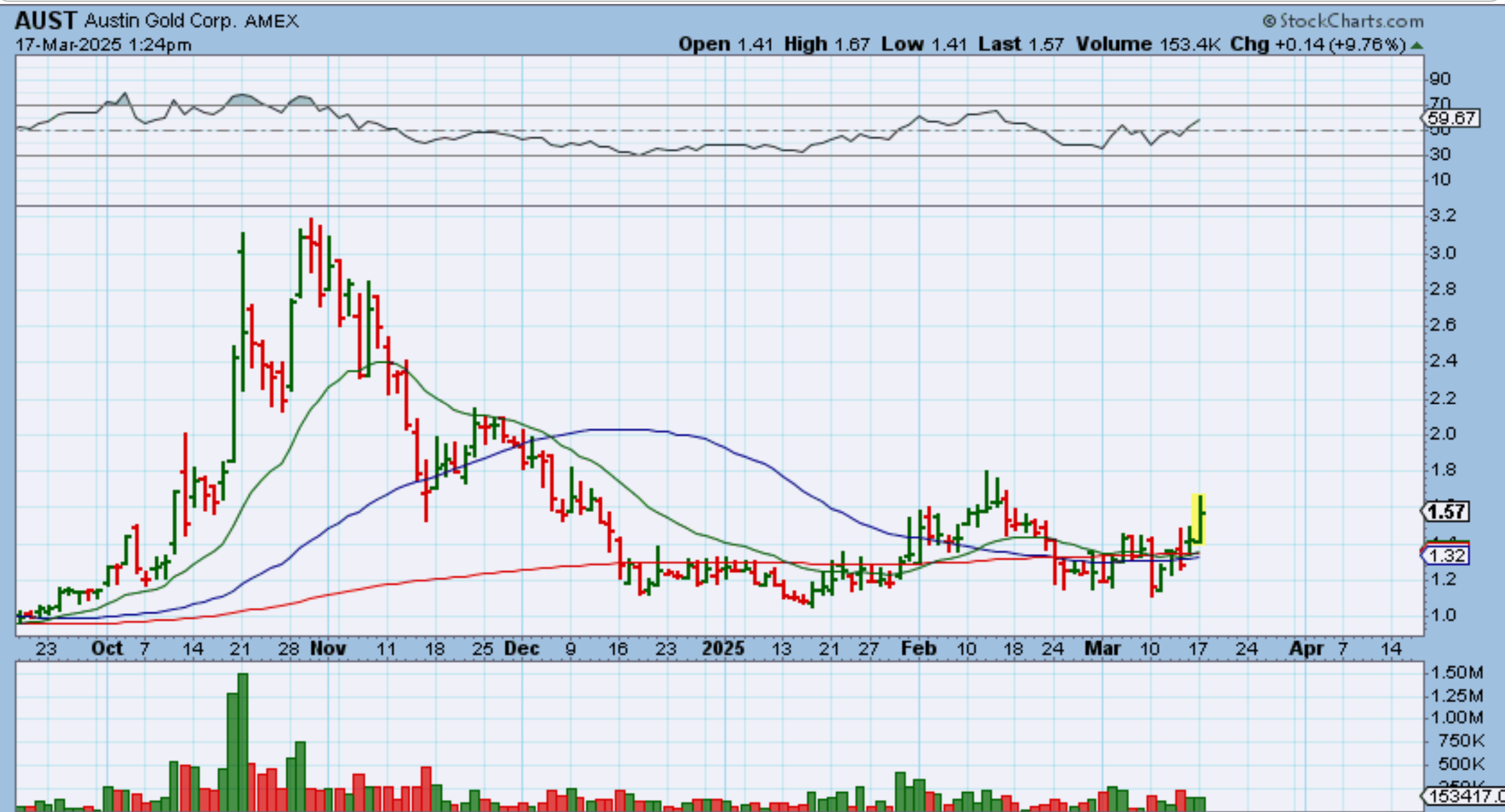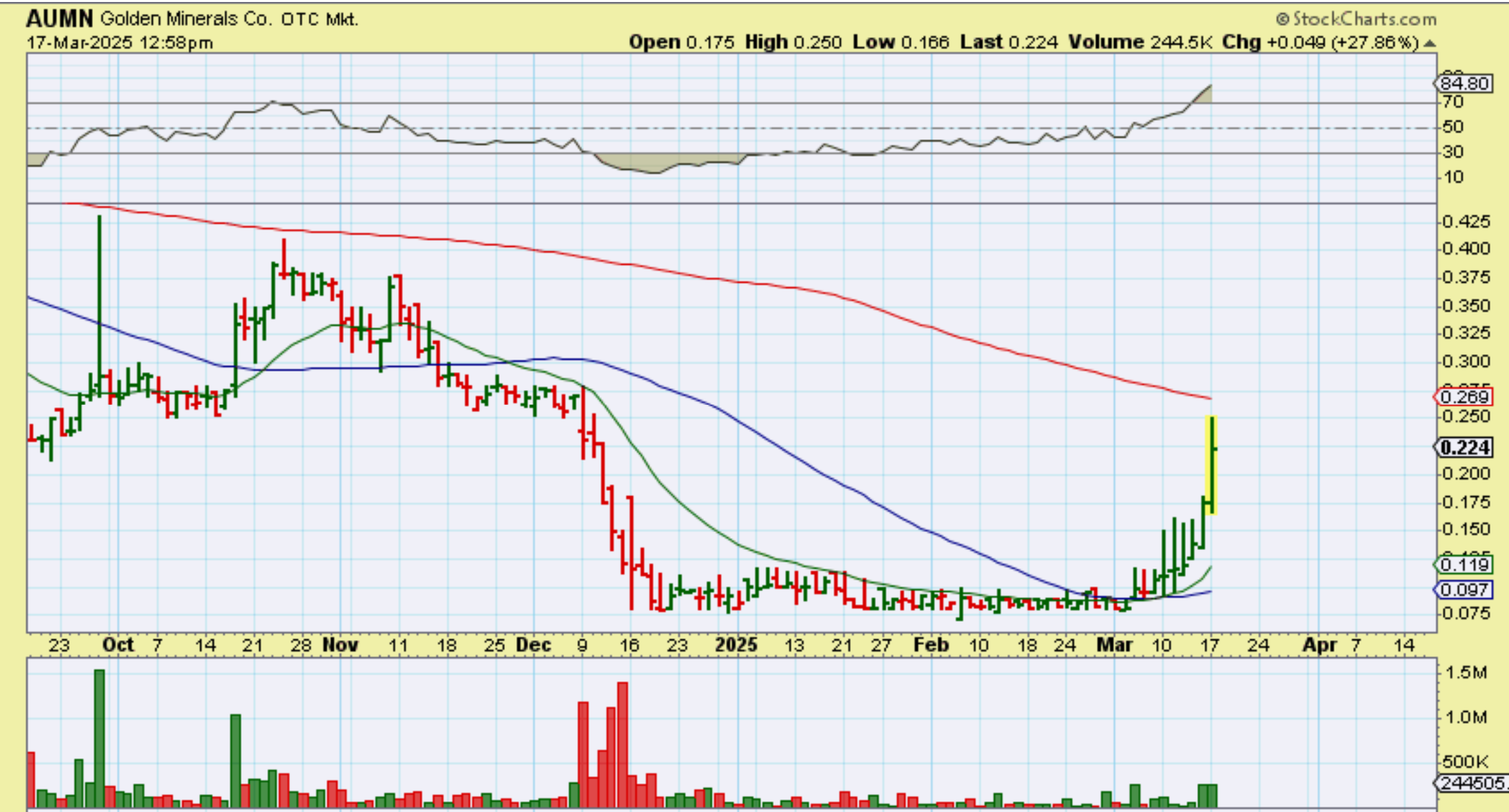 AUMN was beaten down and ugly. I didn’t want to buy it or recommend it, but it just tripled out of that base.