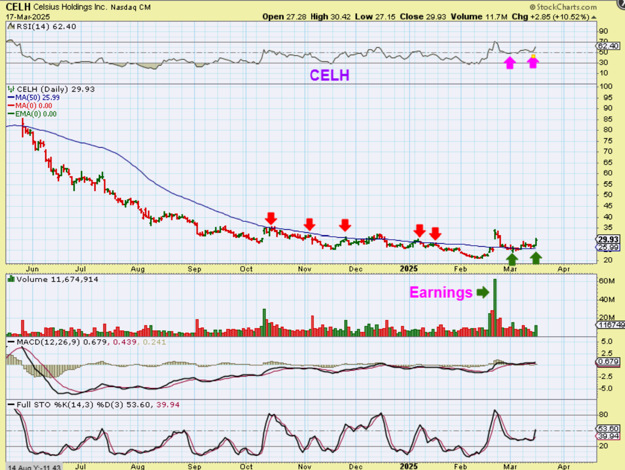 CELH – This stock got crushed, however that big Price Pop in February was earnings based. So CELH ran UNDER the 50sma during its long sell off, and now it Popped over the 50sma and back tested it after earnings. This is a buy & hold base set up.