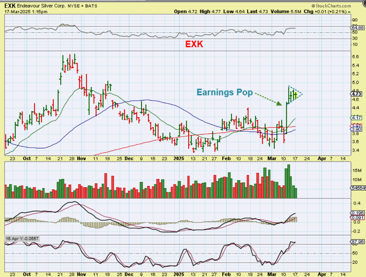 EXK burst higher on earnings and has now formed a pennant. Usually these break out in the direction that they were heading in, if they are found in a bull market.
