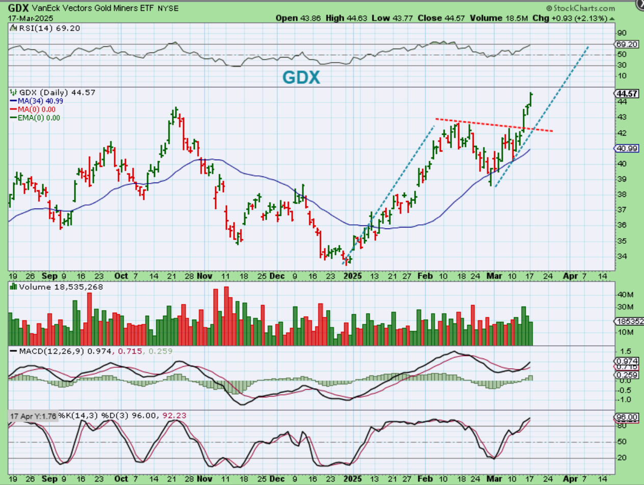 Take a look at The GDX since the buy area at the 34 sma. We have 5 green days in a row, and the basket of miners is doing very well. I pointed out some Silver stocks in recent reports as laggers playing catch up…Silver stocks are still running well too, as you’ll see.