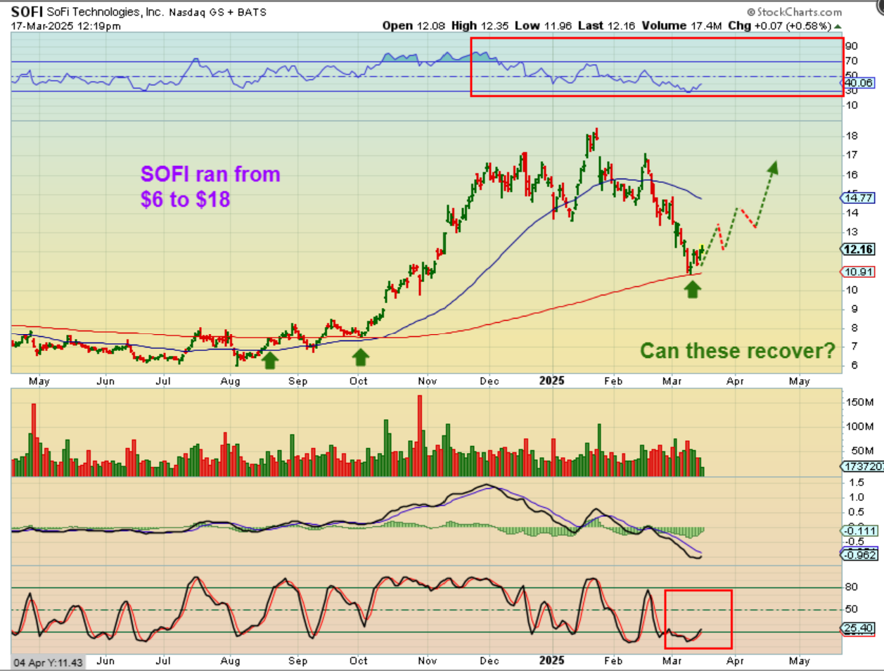 SOFI was also a great stock in 2024, running from $6 to $18, so I have it in my ‘great runners’ check list 🙂 It dropped right to the 200sma and has reversed about 4 days ago. If our Bull market continues and it ‘only’ returns to the highs, it is roughly a double.