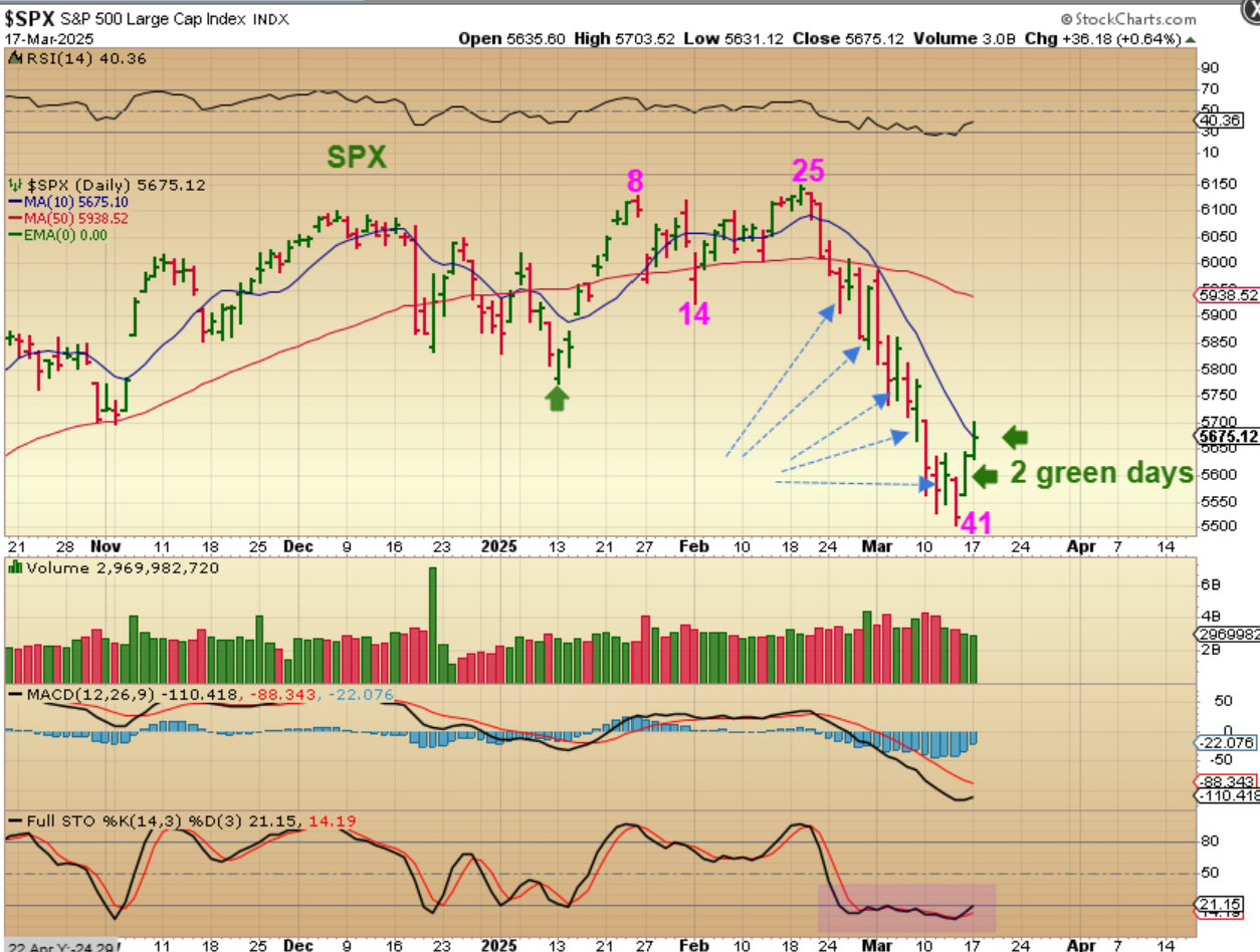 SPX – Do you recall what I said about all of the past large green candle days? I said that we keep getting 1 green day and then it rolls over. I then said that if I see 2 green candles in a row, I would likely assume that we have the lows in place, since this would be a change in character. It looks like we should have a day 41 low (The ONLY possible problem is the Fed Day Wednesday).