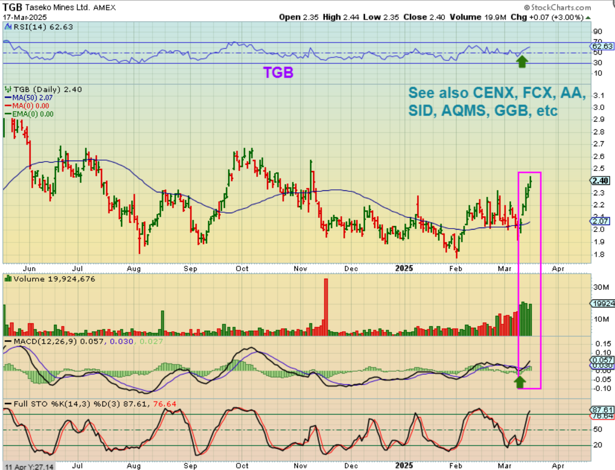 TGB has 5 days straight up, when the markets were still dropping lower. I have listed a few of the other metals stocks that look bullish.
