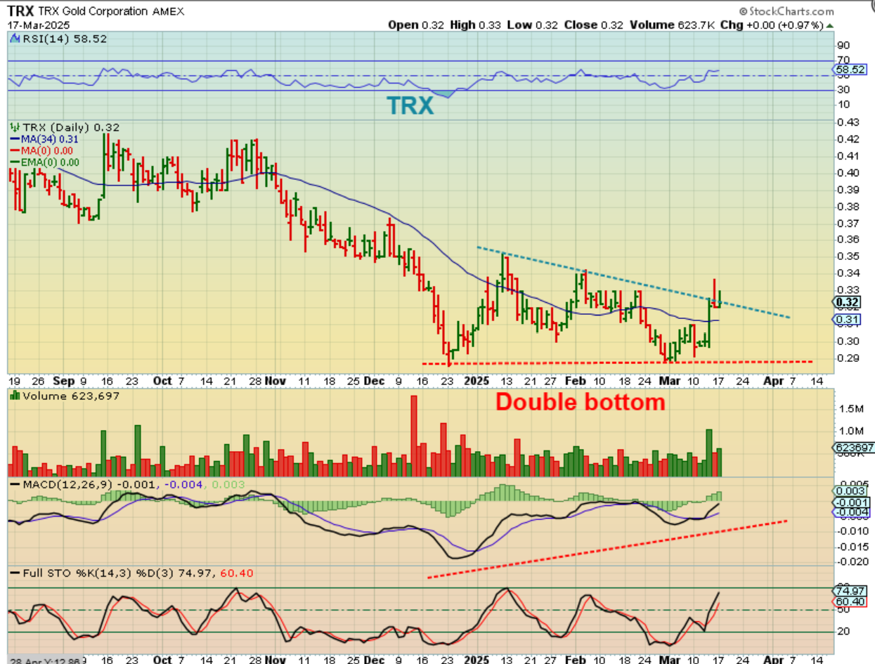 I think that TRX could be getting ready to go too. I see large divergence at the double bottom & a MACD cross. It has tried to break the downtrend line twice but then sold back off. Of course, a small company like this can do a ‘public offering’ to raise cash and that ruins the trade, but this set up is a bullish one.